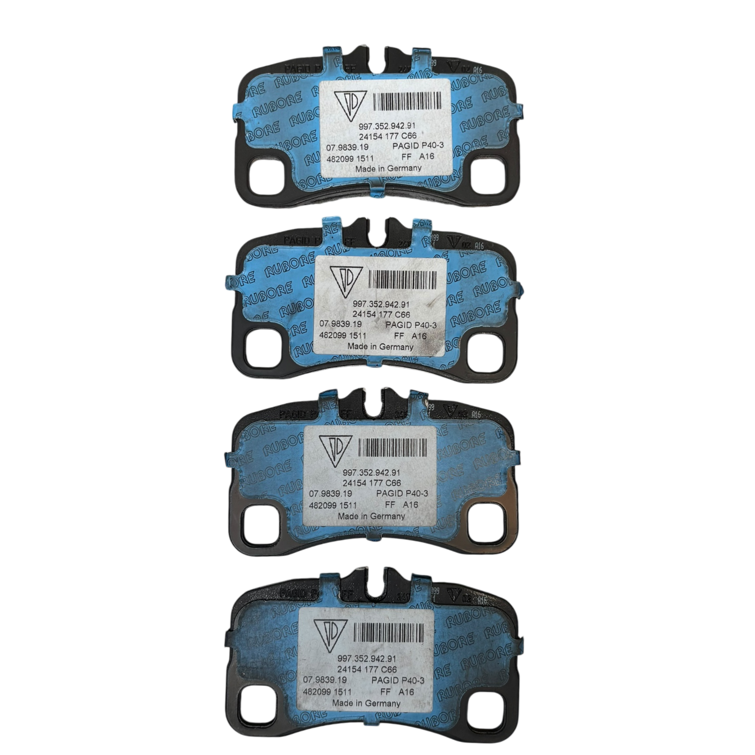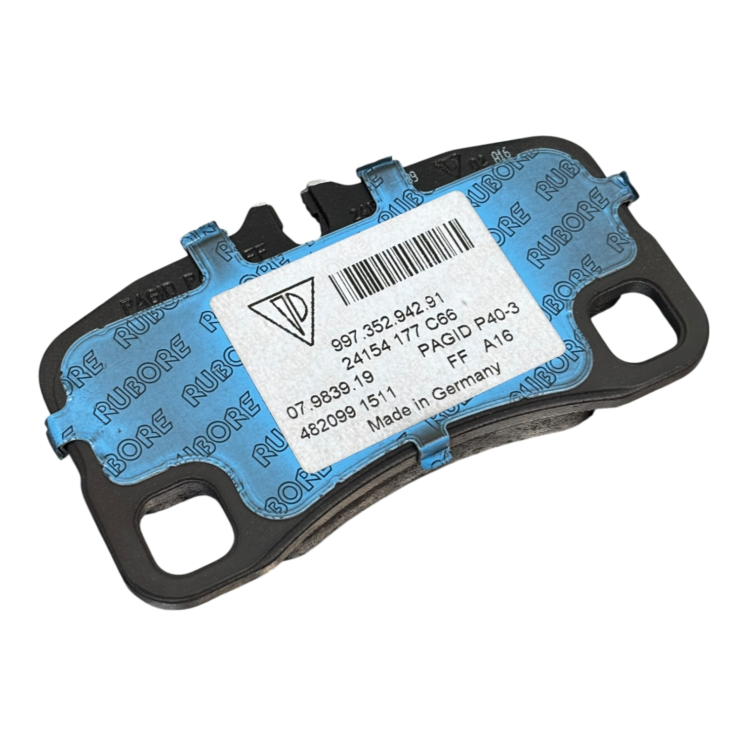 * Adhesivo “RUBORE”: Como se observa en la imagen, la cara posterior está cubierta por una lámina azul protectora de la tecnología RUBORE. Este es un sistema de laminado avanzado que reduce drásticamente la transmisión de vibraciones y ruido entre la pastilla y los pistones de la pinza, garantizando un frenado silencioso incluso en condiciones de pista.